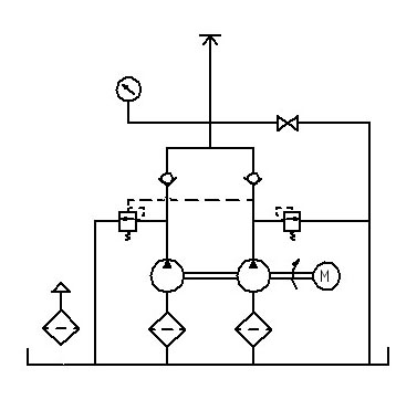 本泵為雙聯(lián)定量泵。低壓時(shí),高低壓同時(shí)供油,可獲得大的流量,加快空行程;高壓時(shí),僅高壓泵供油,可獲得超高壓,此時(shí),低壓泵空載回油,既可減少功率損失,又能減輕油的發(fā)熱。
