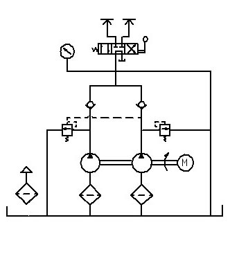 本泵為雙聯(lián)定量泵。低壓時(shí),高低壓同時(shí)供油,可獲得大的流量,加快空行程;高壓時(shí),僅高壓泵供油,可獲得超高壓,此時(shí),低壓泵空載回油,既可減少功率損失,又能減輕油的發(fā)熱。